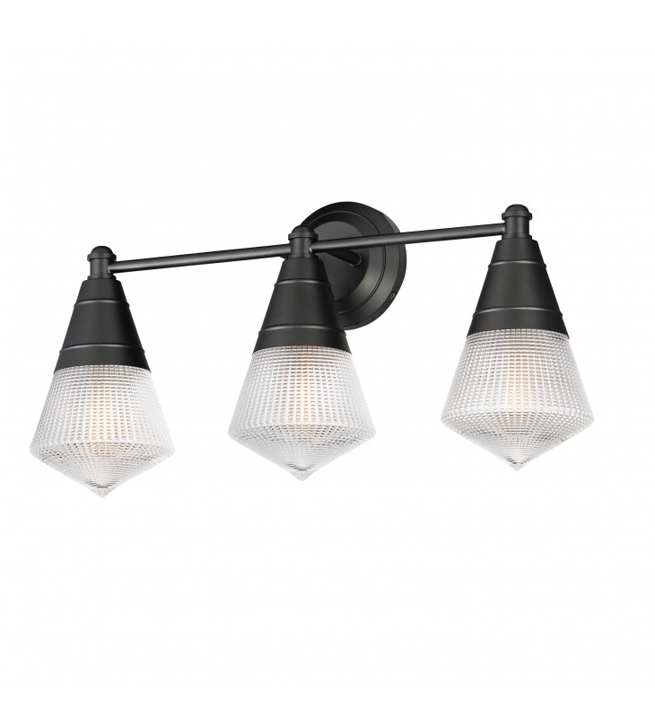 A prismatic diffusion of light is housed within pressed cone glass shades. Choose from pendants with tapered metal halves that conceal the light source or glass shades that are supported by a metal ring. Coordinating bath vanity lights complete the collection.