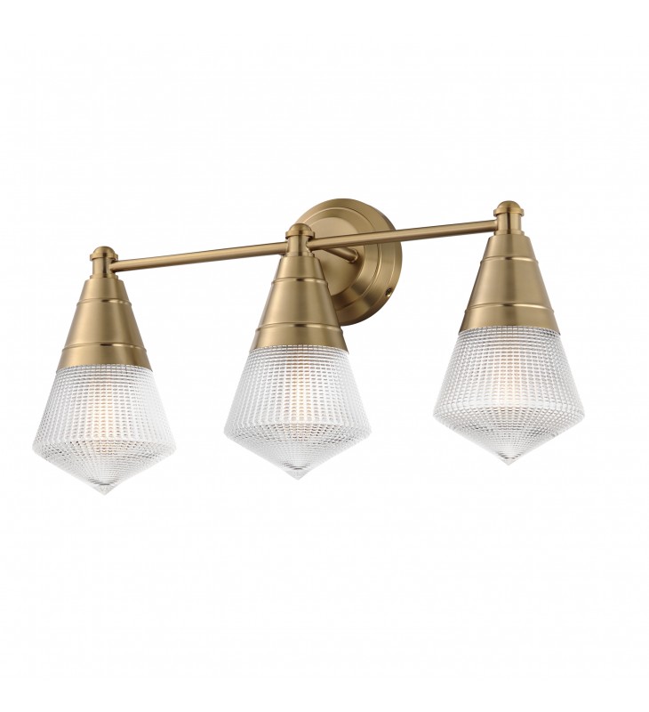A prismatic diffusion of light is housed within pressed cone glass shades. Choose from pendants with tapered metal halves that conceal the light source or glass shades that are supported by a metal ring. Coordinating bath vanity lights complete the collection.