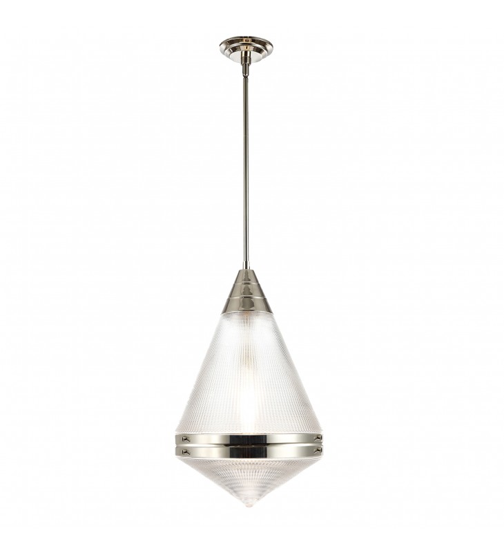 A prismatic diffusion of light is housed within pressed cone glass shades. Choose from pendants with tapered metal halves that conceal the light source or glass shades that are supported by a metal ring. Coordinating bath vanity lights complete the collection.