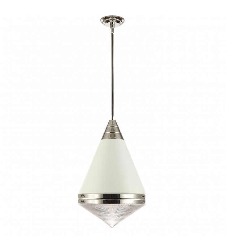 A prismatic diffusion of light is housed within pressed cone glass shades. Choose from pendants with tapered metal halves that conceal the light source or glass shades that are supported by a metal ring. Coordinating bath vanity lights complete the collection.
