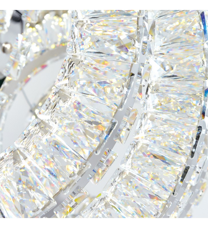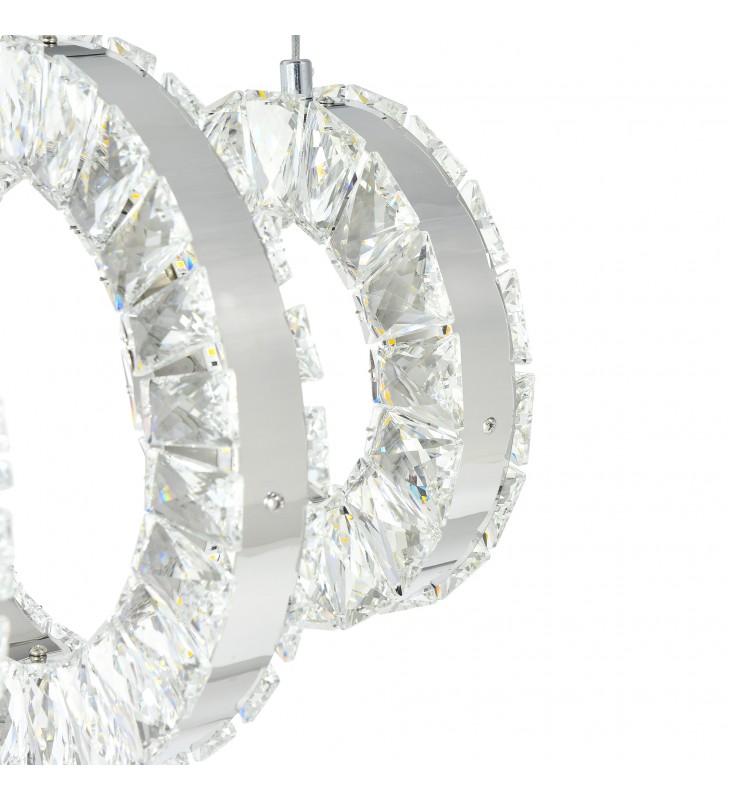 A modern chandelier with a twist. The oversized Celina LED Chandelier will wow you and your guests with its massive brilliance. Interlocking rings of varying sizes suspend, in vertical oriental, from a round chrome canopy. This glistening chandelier shimmers with an elegant sparkle that works in contrast with the fiery glow of a fireplace.