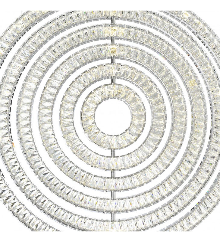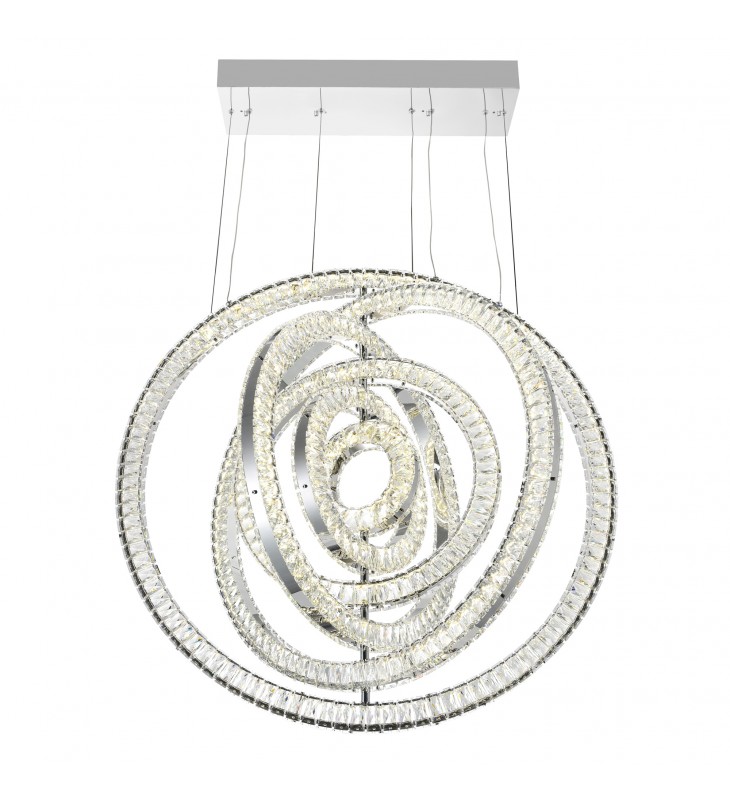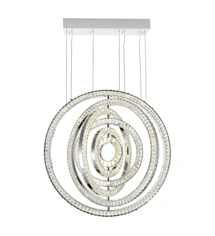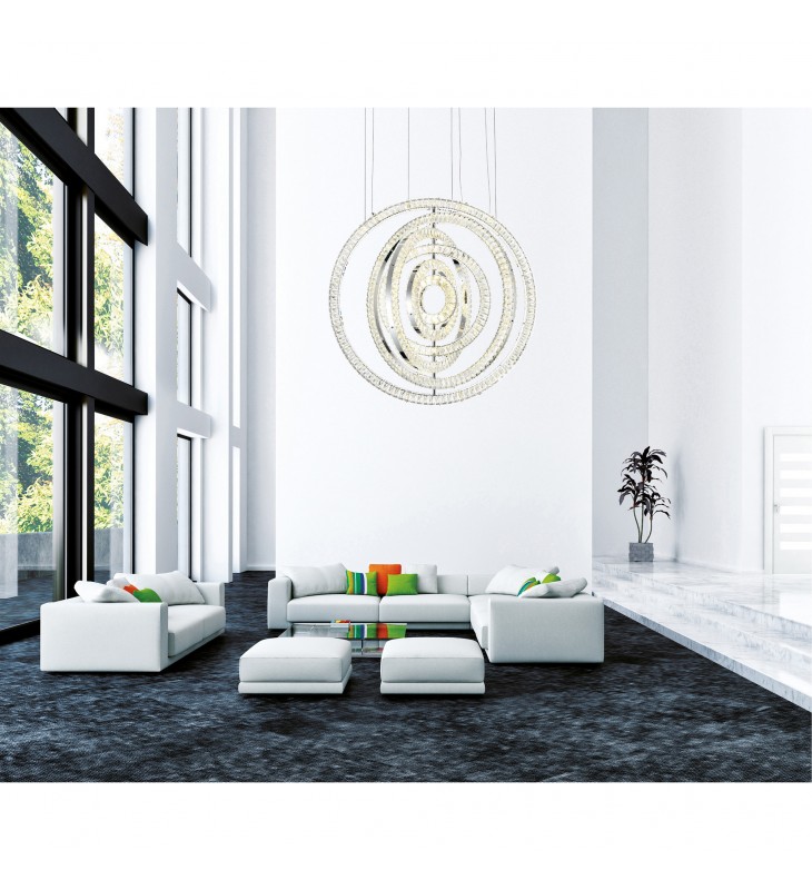 This shapely 37 inch Celina LED Chandelier can effortlessly reinvent the look of your living space. It features a glittering pendant with a silhouette reminiscent of an archery target. This round pendant allows you to subtly play with shape and scale while keeping your decor refined and stylish.