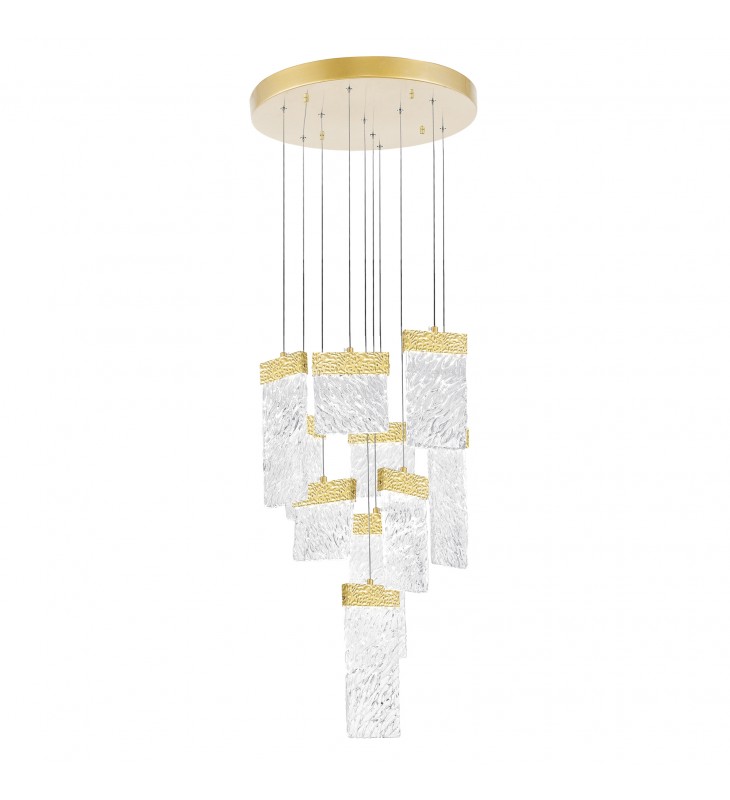 The Carolina Gold Leaf 20 inch LED Chandelier is designed with ten hanging quadrilateral panels with integrated LED. Each sophisticated clear glass panel has a textured metal holder in gold leaf finish. Suspended from a round canopy, these glowing floating panels offer a luxurious vibe when lit. This one-of-a-kind suspension light looks best in modern and contemporary entryways, sitting areas, and dining rooms.
