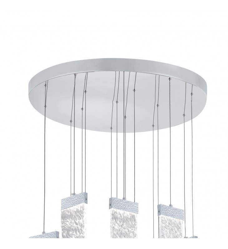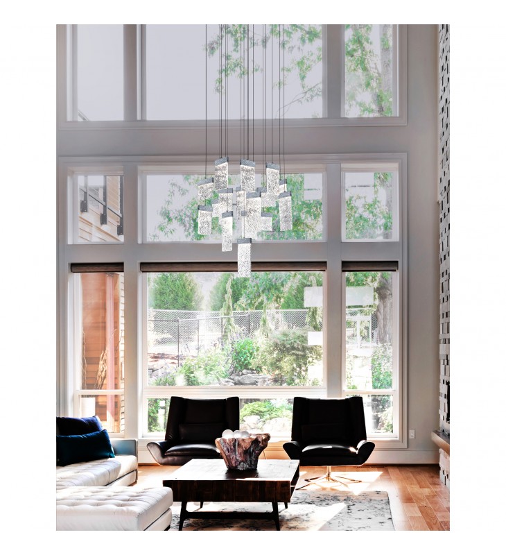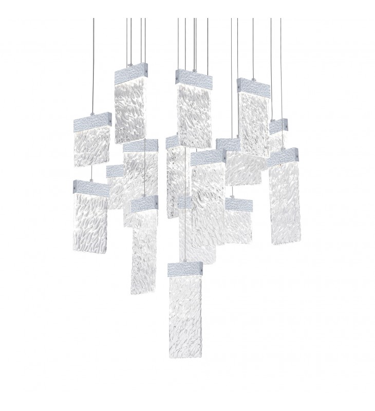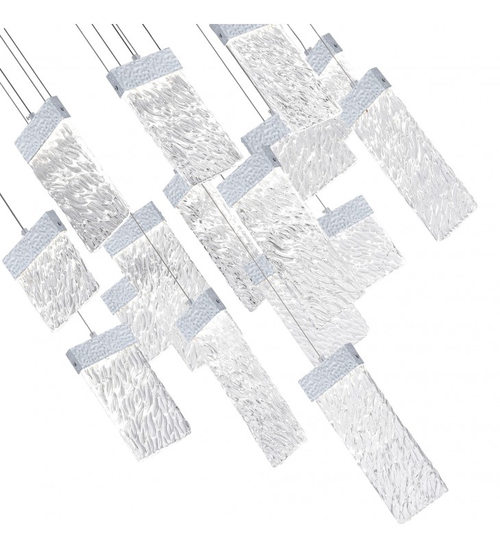 Edgy but with a soft and feminine essence, the Carolina Pewter 32 inch LED Chandelier is ready to give your home an elegant finish without making your interiors look and feel stuffy. This modern down chandelier features a round canopy holding 16 textured clear glass panels with integrated LED chips. This light source easily adds contrast, layer, texture, and style to wherever it is placed.