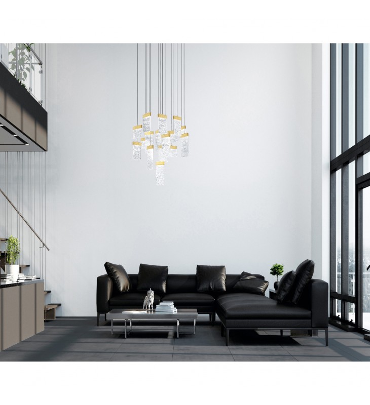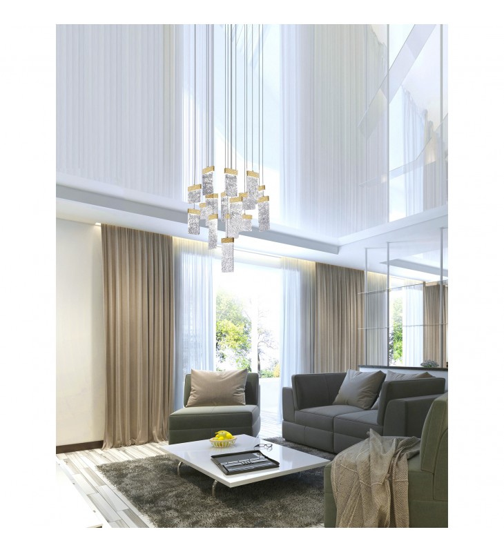 Liven up your whole space with the extraordinary glow of Carolina Gold Leaf 32 inch LED Chandelier. This light fixture features a round canopy in gold leaf finish holding textured glass panels with integrated LED. Each floating panel has an adjustable cord so you can adjust the height according to your preferred drop. Expect this stylish source of light to add a dash of drama on a tall ceiling and instantly amaze your guests.