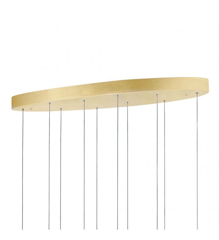 Add scale and a sense of grandeur to your space with the Carolina Gold Leaf 40 inch LED Chandelier. This show-stopping down chandelier features an oval canopy in gold leaf finish holding ten clear glass panels with integrated LED. The floating quadrilateral panels of light diffuse a glow of luxurious beauty into the room. This is the perfect light source when you want to add a touch of opulence to your space while maintaining its airy and inviting vibe.