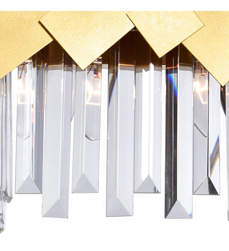 Revamp your boring space with this light fixture that gracefully refracts light. The Panache 3 Light Wall Sconce is an 18 inch wide vanity light with a rectangular frame enveloped by square and rectangular metal cut-outs finished in medallion gold. Dropping from the golden frame are clear crystal prisms hiding the three candelabra-based bulbs. Illuminate a powder room, bathroom, or walk inch closet with the stunning glow of this wall light.