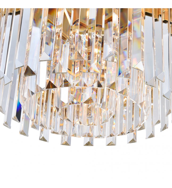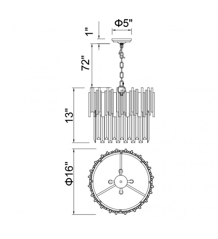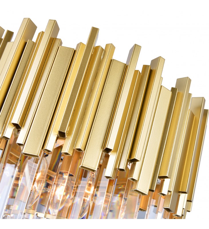 Dress up your space with something unique and interesting. Hang the Deco 4 Light Chandelier in your kitchen, home office, bedroom, or your spacious walk inch closet and see it give your space an instant glow up. This down chandelier is designed with a round frame of medallion gold bars suspending from a golden chain. Dropping from the golden metal frame are clear crystal prisms that surround four candelabra-based bulbs. This chandelier measures 16 inches in diameter.