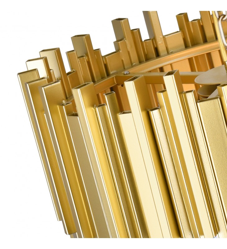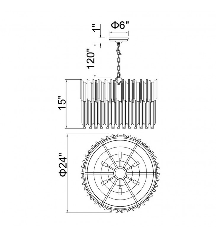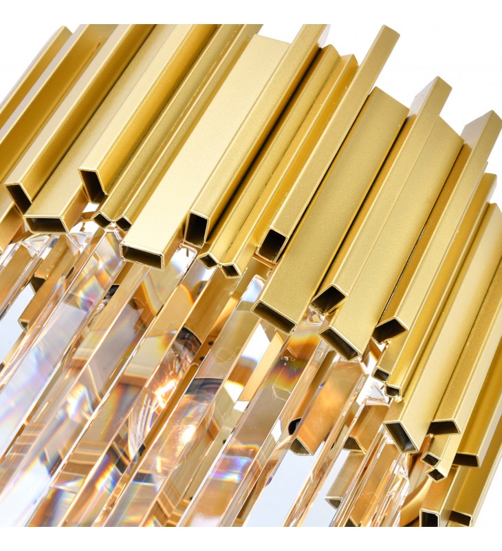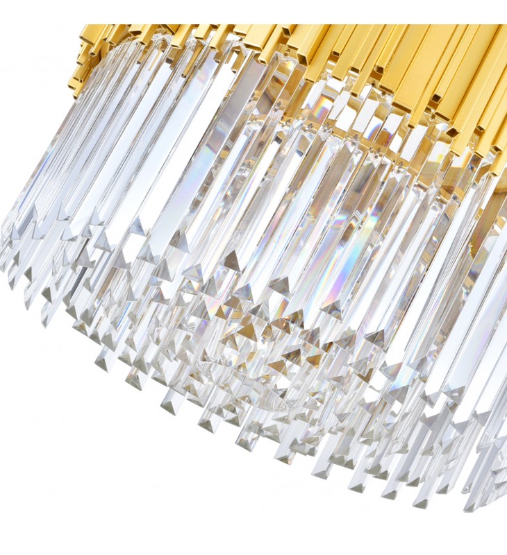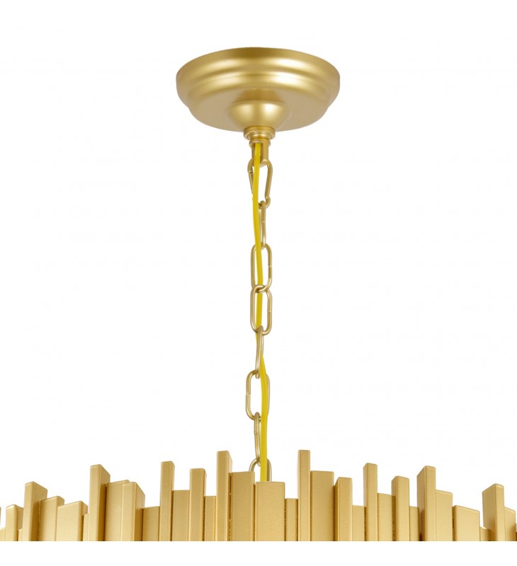 Make a big design statement in your living space or high-ceiling bedroom by installing the Deco 7 Light Chandelier. Finished in medallion gold, this down chandelier casts an elegant glow and rounds out a space with regal charm. It is designed with a 24 inch shade with a frame designed using a circular assembly of narrow metal bars in gold finish. Encircling the seven candelabra-based bulbs are circular rows of clear crystal prisms.