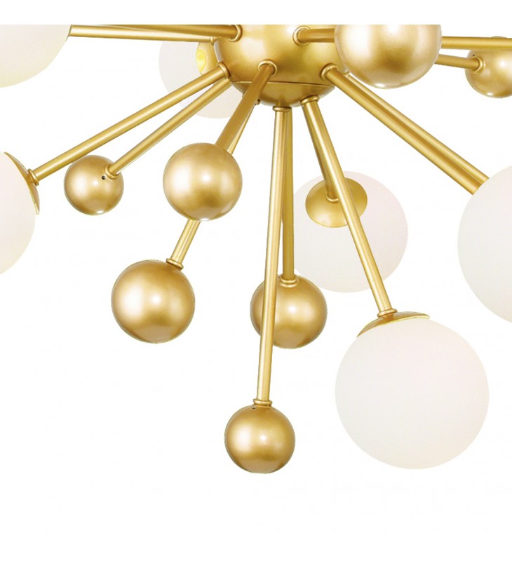 The Element 8 Light Chandelier in Sun Gold is one you can count on when you need to add a little quirkiness to a room. With its subtle elegance and modern minimalism, this 16 inch cluster of frosted glass shades is the perfect illumination for a bedroom, a guest room, kitchen, or a large bathroom. Step up the feeling of luxury in any room with this golden Sputnik chandelier.