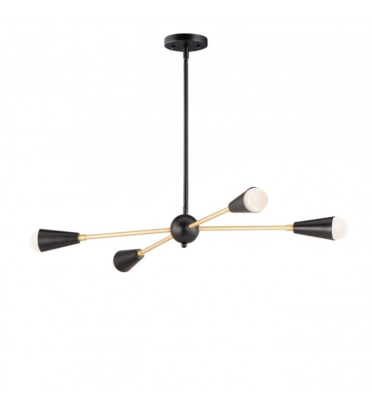 A classic mid-century look, the Lovell collection features two sizes of sputnik chandeliers and streamlined sconces perfect for bath vanity applications. Available in a Black/Satin Brass finish combination. Light bulbs nest inside the metal cones to become an element of the design.