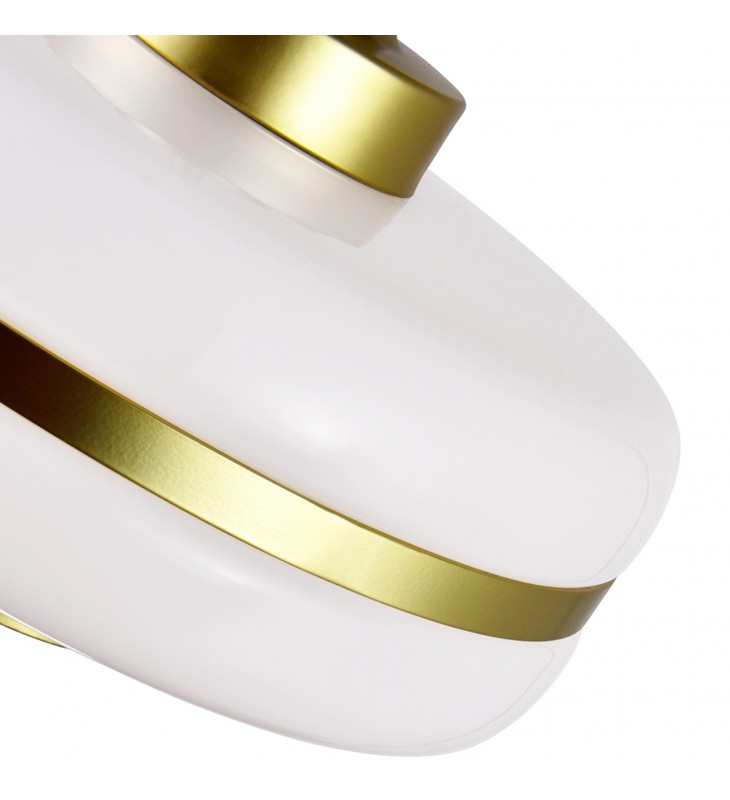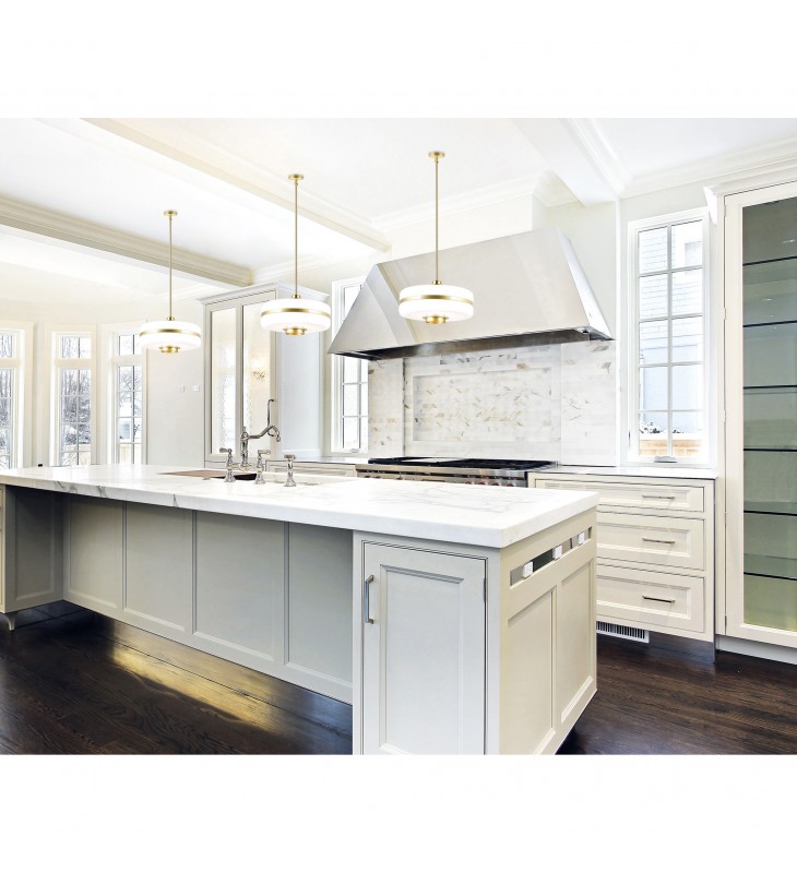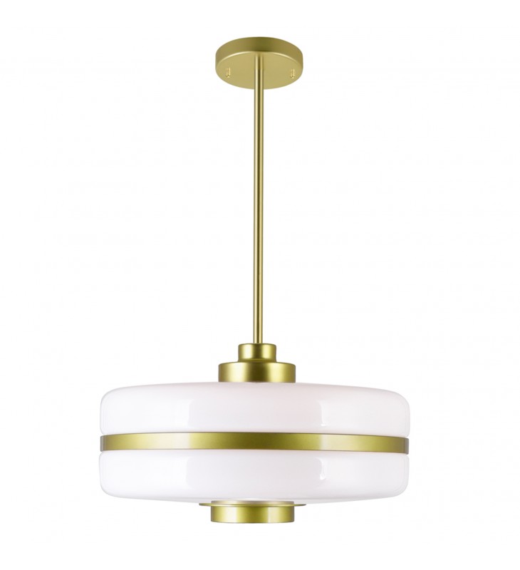 Bring a splash of contemporary style to your space with this 16 inch Elementary 1 Light Pendant. Suspended from an adjustable downrod is a white glass pendant with pearl gold midline ring accent. The combination of white and gold finishes gives this piece a neat and sleek look. This fixture is compatible with a dimmer.