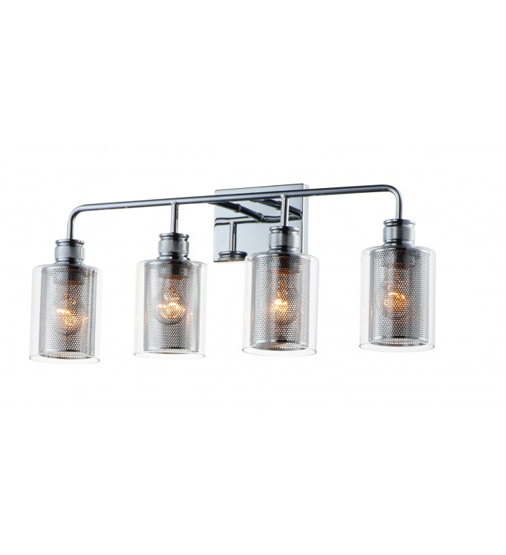 Clear glass cylinders lined with mesh screen are supported by knurled cups of Polished Chrome creates a contemporary design with an industrial twist. This economical collection provides a designer