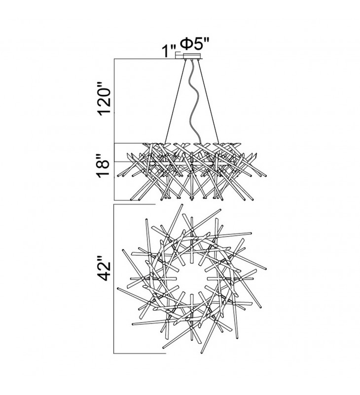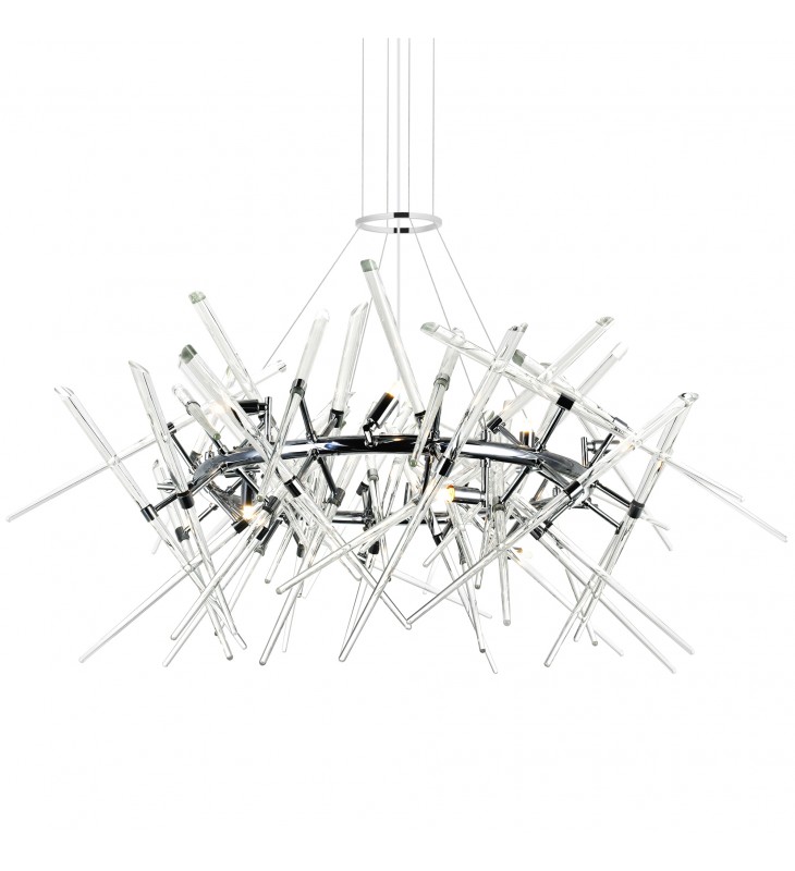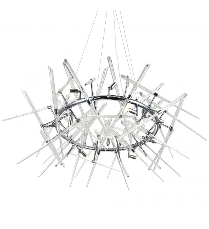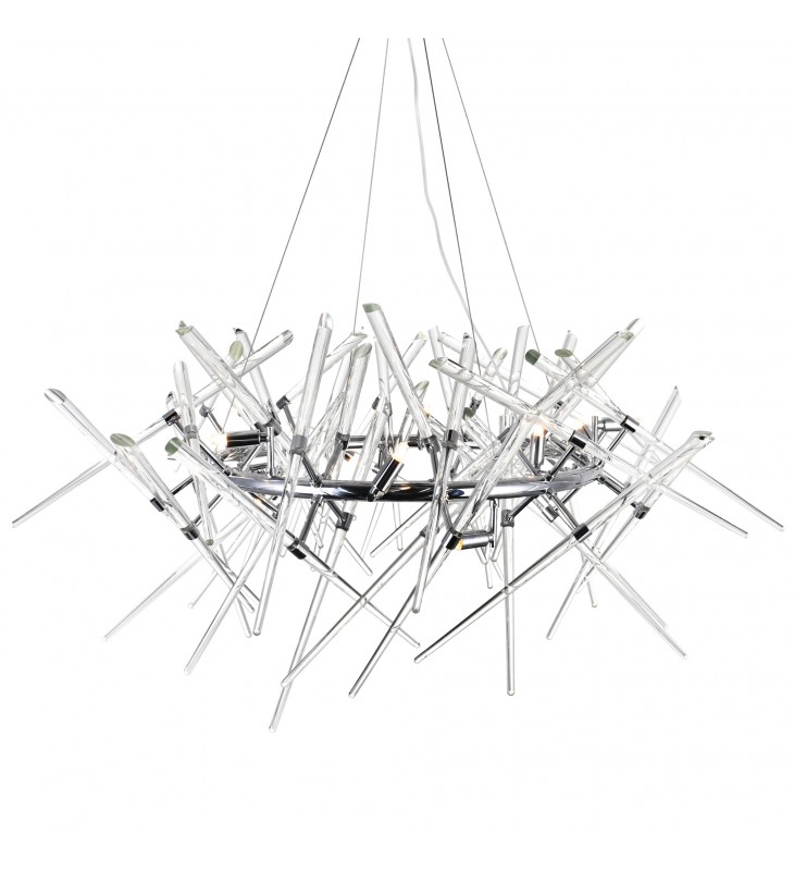 The Icicle 12 Light Chandelier is not for the faint of heart. This striking wreath-like light fixture has a round metal frame in chrome with spiking rods made from clear glass. The impressive architectural pendant has a 42 inch diameter and an 18 inch height. Twelve bulbs nestled within the sculpture reflects and refracts light. The visual aesthetics of this piece will add intrigue to any room.