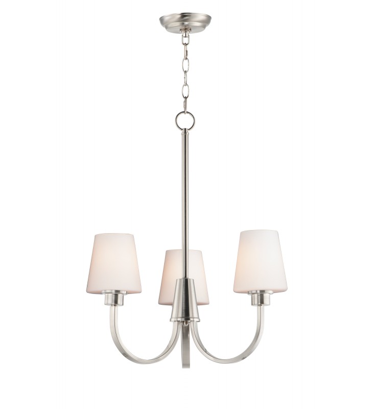 Graceful arcs of rectangular tubing transition to round cups that support tapered Satin White glass shades creating a crisp and clean transitional design. The frame is finished in your choice of Satin Nickel or Black which bridges modern and transitional design aesthetics.