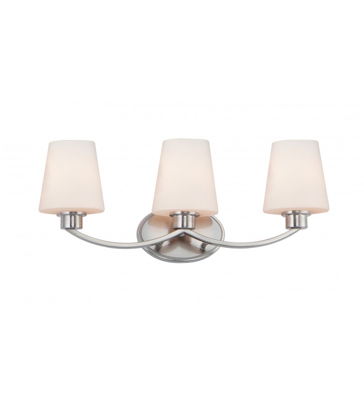 Graceful arcs of rectangular tubing transition to round cups that support tapered Satin White glass shades creating a crisp and clean transitional design. The frame is finished in your choice of Satin Nickel or Black which bridges modern and transitional design aesthetics.