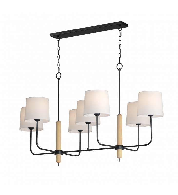 Natural White Oak wood details are featured plainly on a slim Matte Black metal frame. Oversized off-white linen shades cover sockets for a minimalist and natural look. Available in multiple configurations of chandelier and a wall sconce.