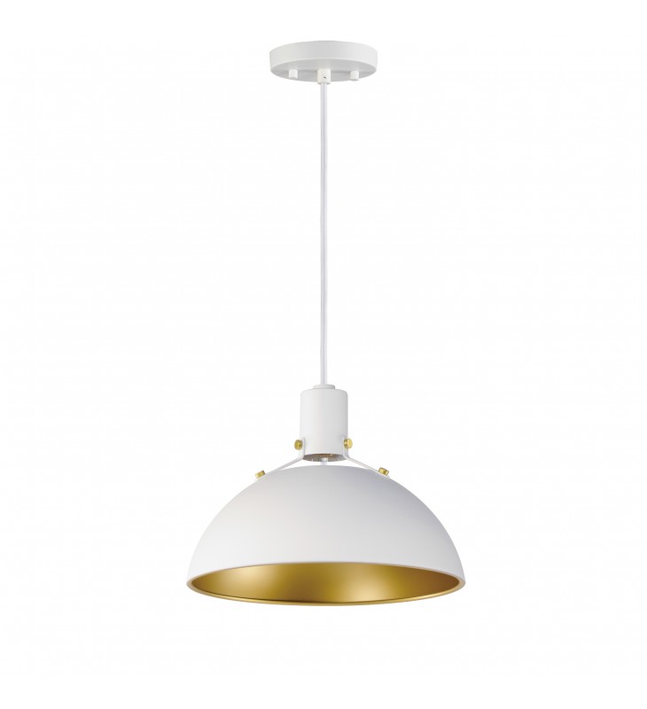 Sockets are suspended above a metal spun dome in your choice of Black or White with Gold accents or Satin Nickel with Black accents. A clean and simple approach to modern or transitional lighting, the opening allows light to shine through the opening atop while providing functional light below. This break in the two parts is supported with straps and decorative rivets in complimentary finishes for a subtlety tasteful two-tone finish. A coordinating pin-up wall sconce offers a bedside application to this design with integrated switch on its back plate and two feet of cord cover that can be removed and hardwired per your preference.