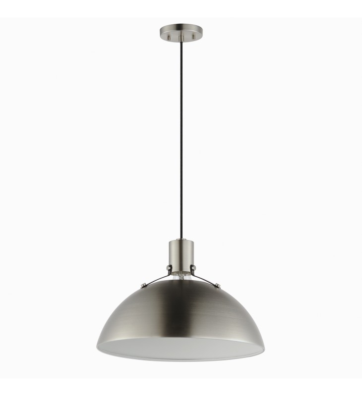Sockets are suspended above a metal spun dome in your choice of Black or White with Gold accents or Satin Nickel with Black accents. A clean and simple approach to modern or transitional lighting, the opening allows light to shine through the opening atop while providing functional light below. This break in the two parts is supported with straps and decorative rivets in complimentary finishes for a subtlety tasteful two-tone finish. A coordinating pin-up wall sconce offers a bedside application to this design with integrated switch on its back plate and two feet of cord cover that can be removed and hardwired per your preference.