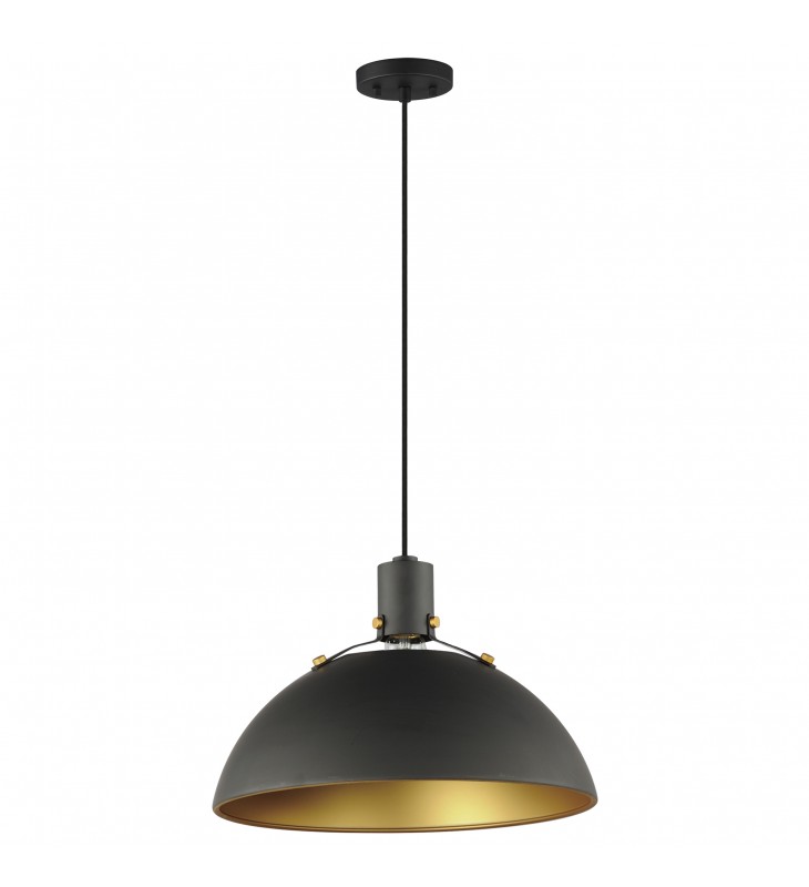 Sockets are suspended above a metal spun dome in your choice of Black or White with Gold accents or Satin Nickel with Black accents. A clean and simple approach to modern or transitional lighting, the opening allows light to shine through the opening atop while providing functional light below. This break in the two parts is supported with straps and decorative rivets in complimentary finishes for a subtlety tasteful two-tone finish. A coordinating pin-up wall sconce offers a bedside application to this design with integrated switch on its back plate and two feet of cord cover that can be removed and hardwired per your preference.