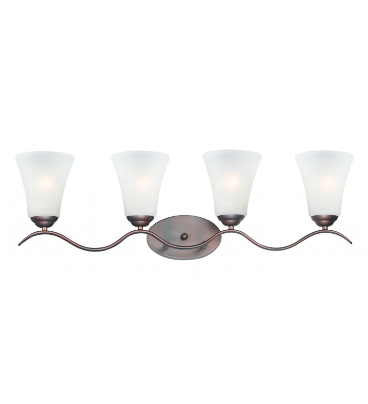 Gently waving arms of Satin Nickel or Oil Rubbed Bronze support tall-profile Frosted glass shades creating a scale normally not found in this category of lighting. The bath vanity may be installed up or down and also includes a Polished Chrome finish.