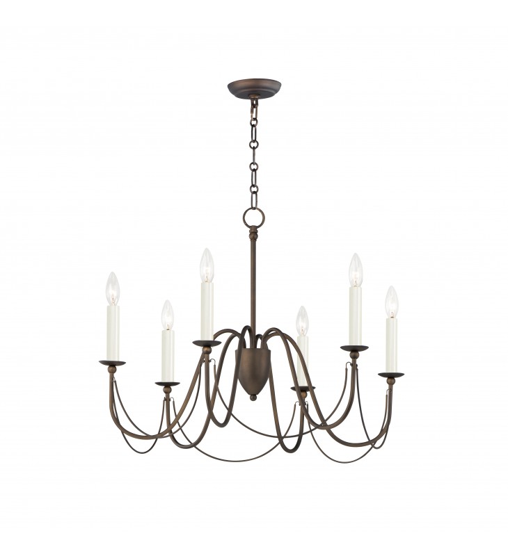 Sweeping metal accents links create classic curves on a minimalist chandelier. Available in hand-rubbed Chestnut Bronze or elegant Gold Leaf finishes. Add crystal accents to elevate the design for a more extravagant glamour. The design manages to evoke French Country charm and enchants any room it illuminates.