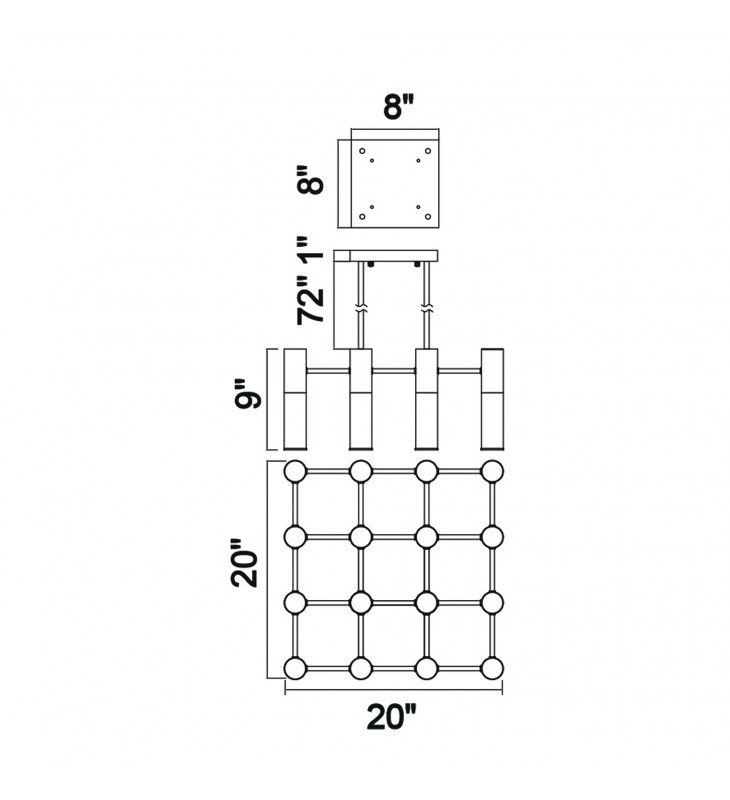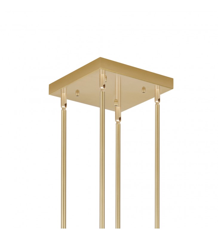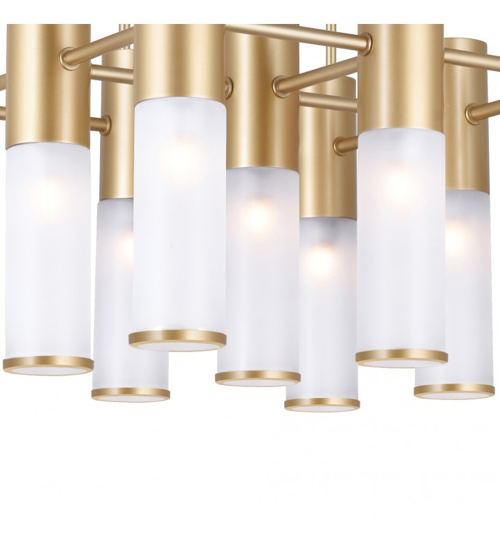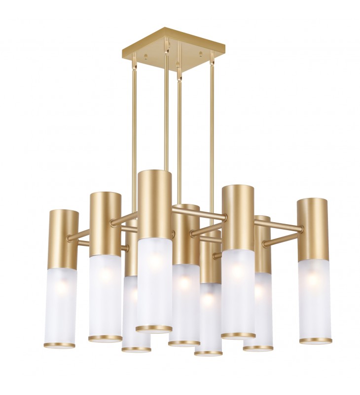 Add a chic touch to that wide, open room in your urban inchdustrial space with the no-frills elegance of the Pipes 16 Light 20 inch Down Chandelier in sun gold finish. A square brass canopy holds four sturdy downrods that connect to a patterned panel of lights. Sixteen narrow frosted glass cylinders requiring G9 LED bulbs will provide ample illumination to your hip and contemporary home.