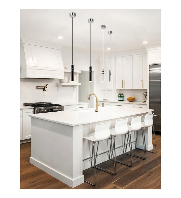 Dress up your dining area or kitchen with the minimalist appeal of the Chime 1 Light Polished Nickel LED Mini Pendant. This small contemporary light fixture can bring drama to a space even with its slender and compact silhouette. Hang three to five in a row over a kitchen island or a cluster at different heights over a dining table. With its adjustable height, you can suspend this whichever way you want for a stylish lighting update.