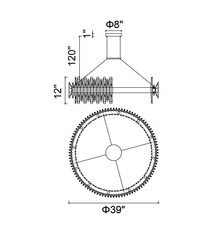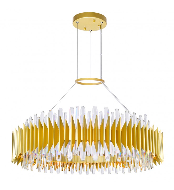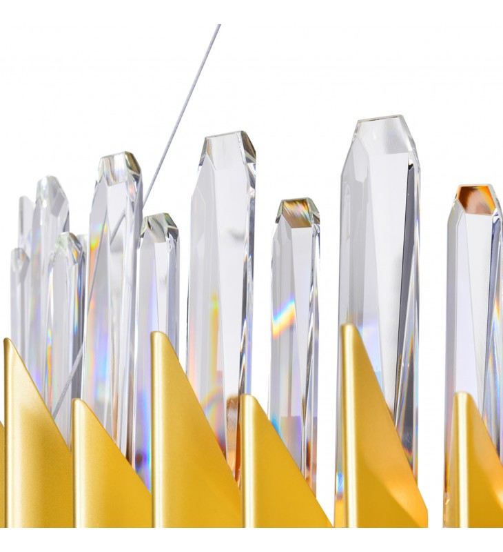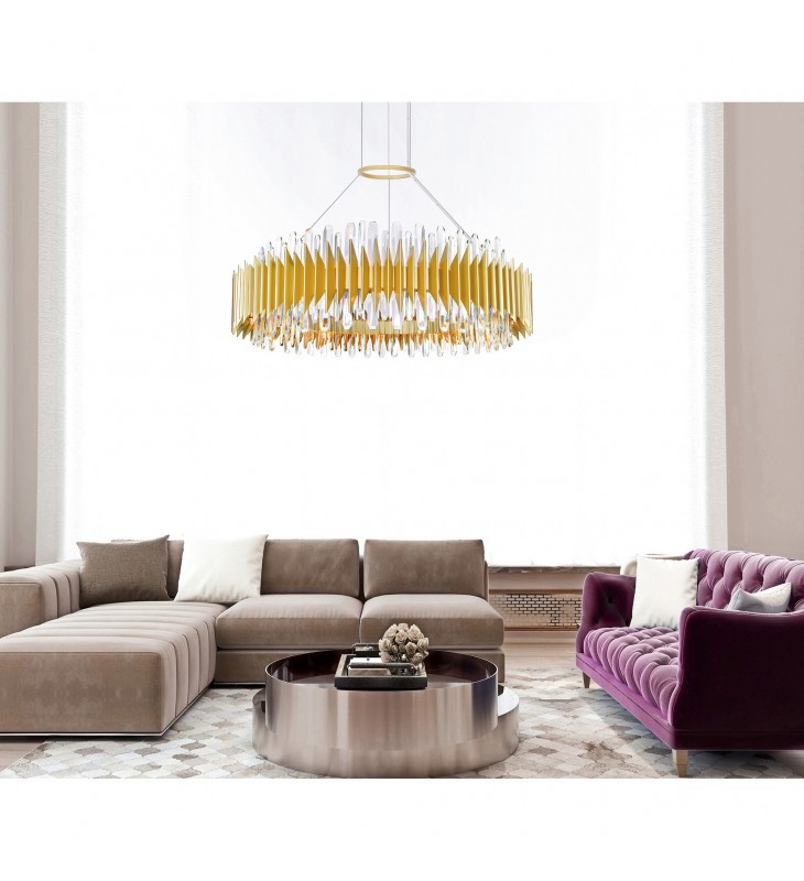 A bright focal point for your modern white living room, the Cityscape 24 Light Chandelier gleams with modern elegance. Finished in satin gold, this round chandelier measuring 39 inches in diameter has clear crystal prisms connected to a golden metal frame in zigzag motif. This is the perfect luminaire to bring an architectural character to a cookie-cutter home.