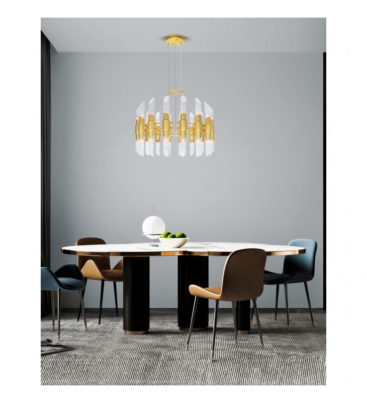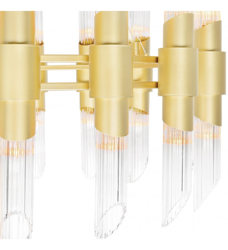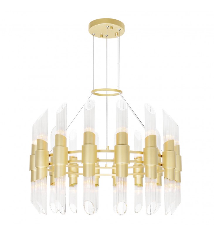A dramatic, non-crystal chandelier perfect for your modern home. The Croissant 32 Light Chandelier features a satin gold round metal base with textured glass tubes for shade. This unfussy chandelier with simple yet notable detail will look at home in any room. Put it in the living room, dining room, kitchen or entryway and let it bring a hint of subtle sophistication to your space.