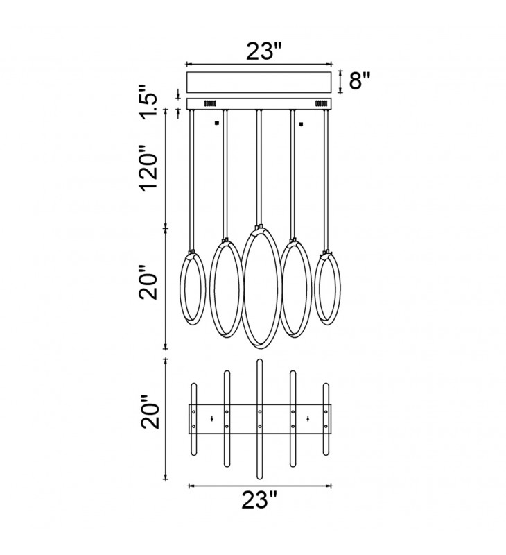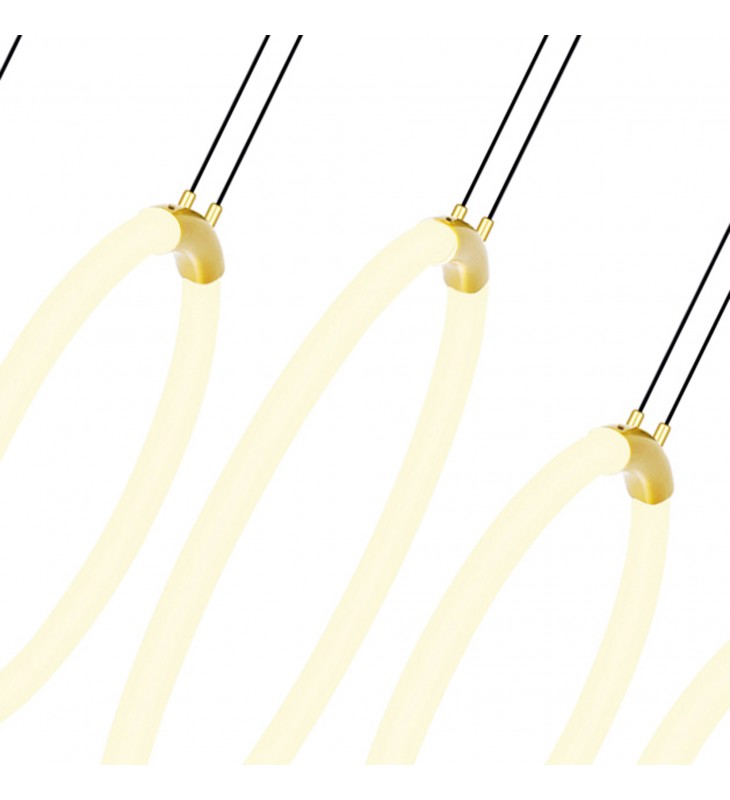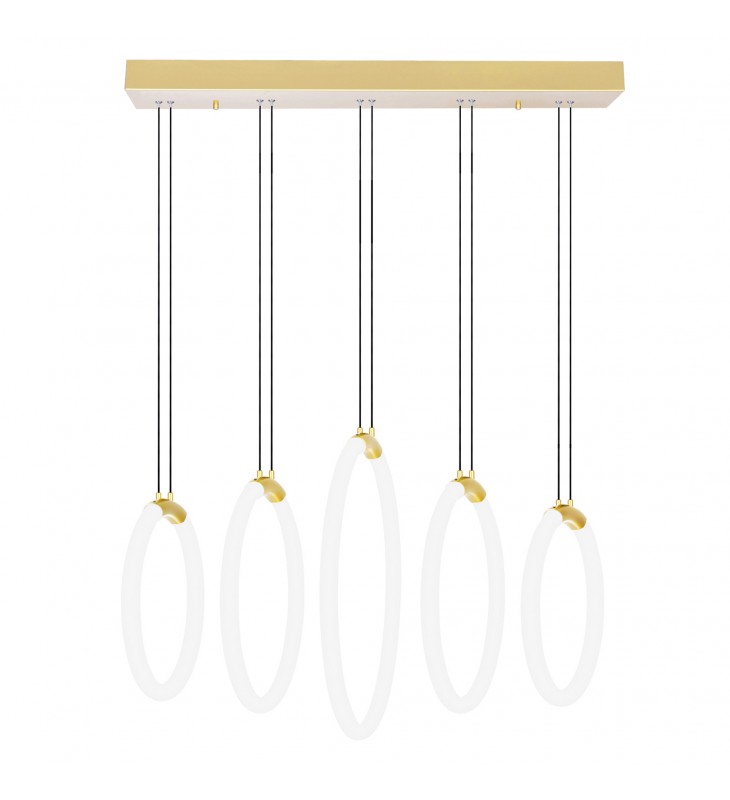 Circle your space with chic illumination and a bit of geometric flair through this Satin Gold Hoops 5 Light LED Chandelier. Slender cables descend from a rectangular canopy and each holds a hoop or ring that delivers delicate light. This fixture is designed with a clean and contemporary silhouette suitable for residential and commercial settings. This multi Pendant light fixture can be used with an ELV dimmer (not included) so you can have total control over the amount of light it gives.