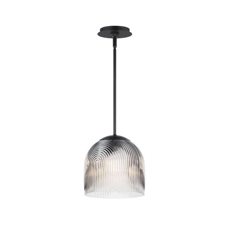 Featuring a concentric, semicircular ribbed glass pattern, this collection offers a blend of familiar design with contemporary flair. The deeply textured glass refracts light beautifully, diffusing glare while delivering ample functional illumination. Metal accents in a Matte Black finish enhance the modern aesthetic. Available in oversized pendant and flush mount configurations, the collection is ideal for larger spaces, combining bold design with practicality.
