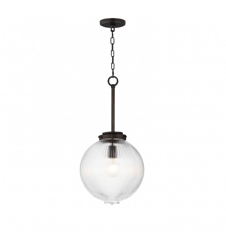 Nostalgic spherical glass volumes with a ribbed pattern and a dipped flat bottom, this collection offers a retro and eclectic choice for pendants and sconces. Available in Oil Rubbed Bronze, Satin Brass, and Satin Nickel, these fixtures provide elegant illumination, adding distinctive style to common spaces.