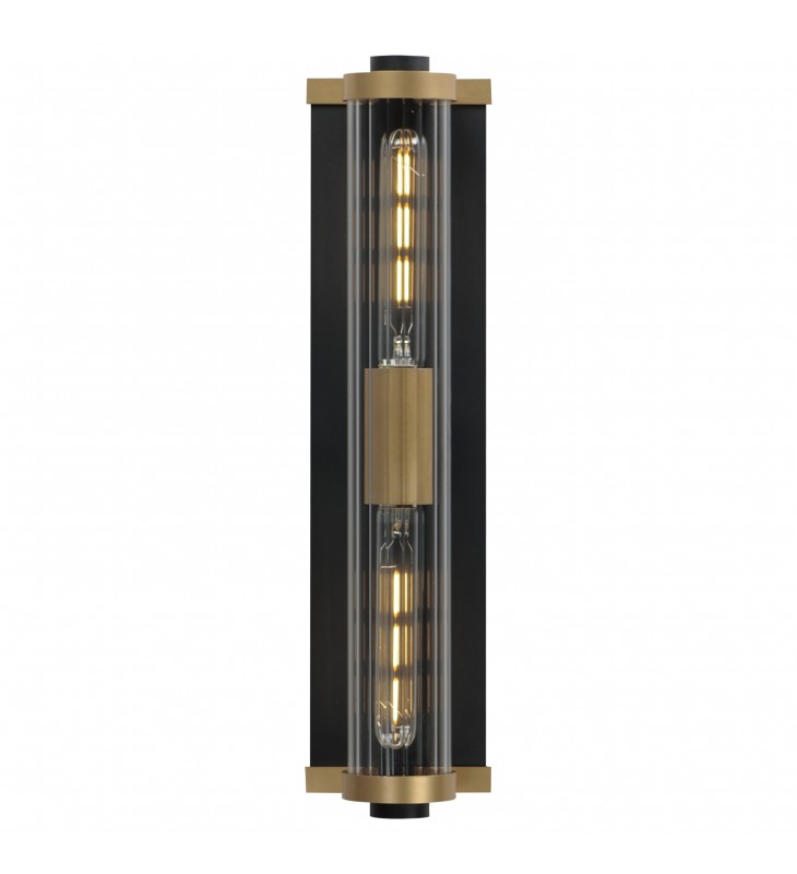 Internally ribbed clear glass tubes refract tubular lamps, creating a shimmering light effect. The glass is supported by a two-tone black frame with Aged Brass accents, making this sconce suitable for both indoor and outdoor installations. With a depth?of less than 4 inches, this ADA compliant sconce may also be used in commercial applications.?.