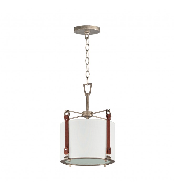 Inspired by the artist enclave north of San Francisco, pastoral elements influence this series of drum shades. Stirrup-like hooks support genuine suede straps in a Tobacco Brown finish which in turn suspend drum shades in an Off-white linen fabric. Metalwork in a hand-applied Weathered Zinc finish frame the frosted glass diffuser at the bottom to softly diffuse the lighting within. Head out West with this rustic, yet refined design.