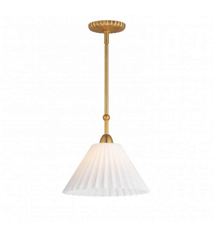 Touches of biophilic details and charming Satin White glass shades modeled on pleated fabric shades create elegant and approachable lighting fixtures. Finished in a rich hand-applied gold leaf, the elongated frame of the chandelier and upturned sconce takes on unique proportions. This collection was designed in collaboration with the eponymous design duo, Kismet House, whose style is embodied in the nostalgic details represented in the shapes, finishes, and overall concept.