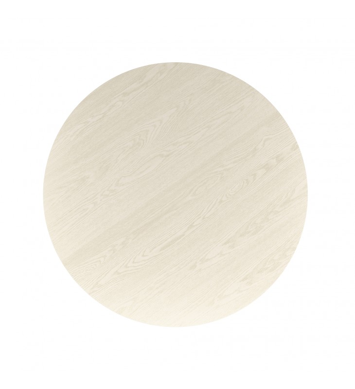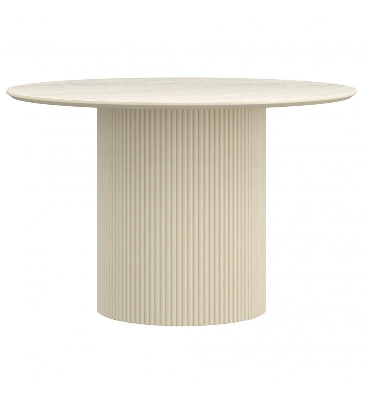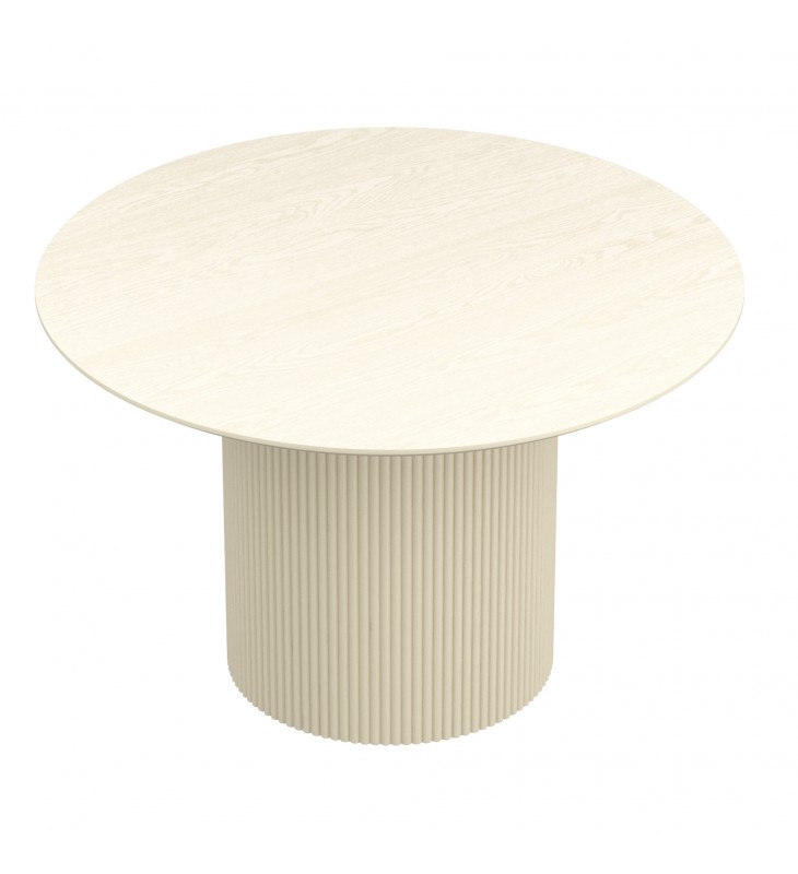 Mid-century modern round dining table; Wide pedestal, engineered wood base with reeded detail; Engineered wood table top with oak veneer; Reverse bevel table top with visible wood grain finish; Mix and match with a variety of chair styles and finishes