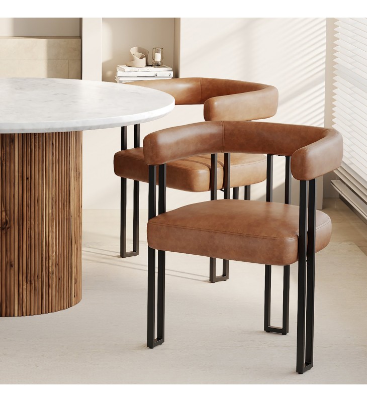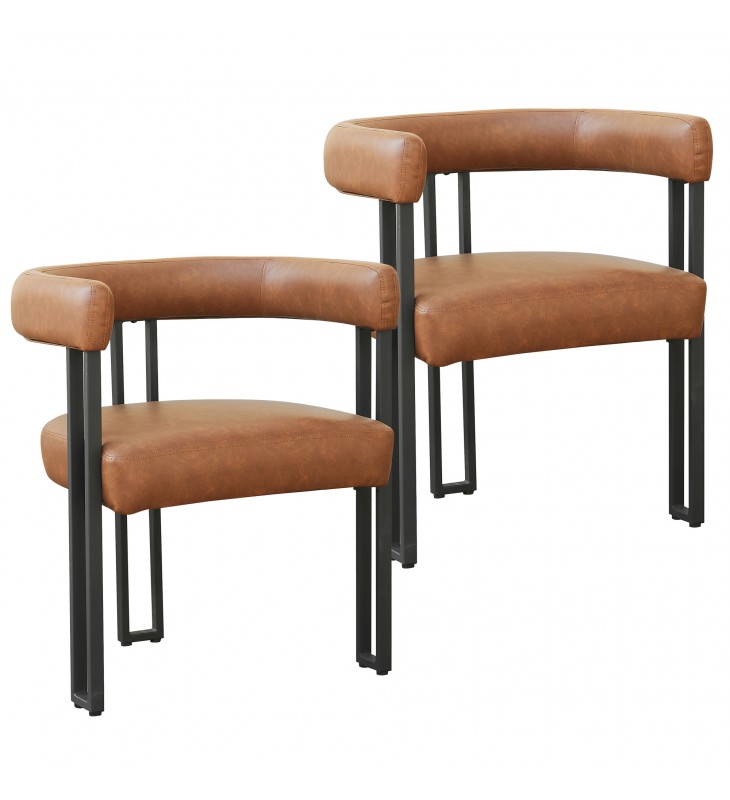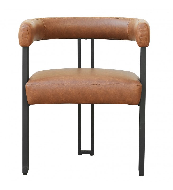 Contemporary dining side chair; Vintage saddle faux leather upholstery; Black metal frame and legs; Medium comfort polyester foam cushion; Approximate weight capacity is 300 lbs; seat height is 18.5\"