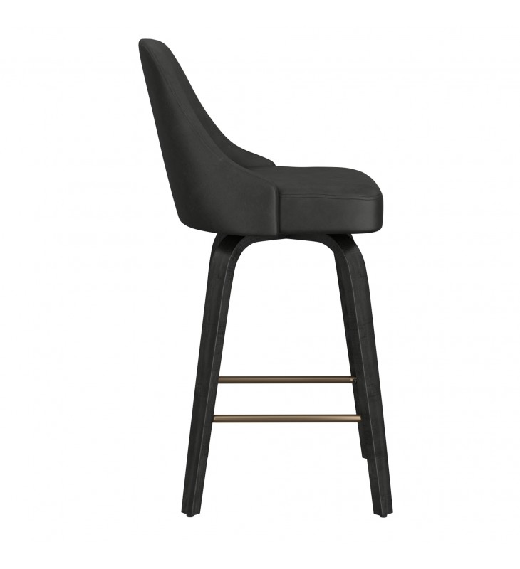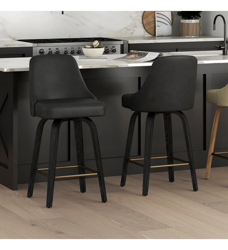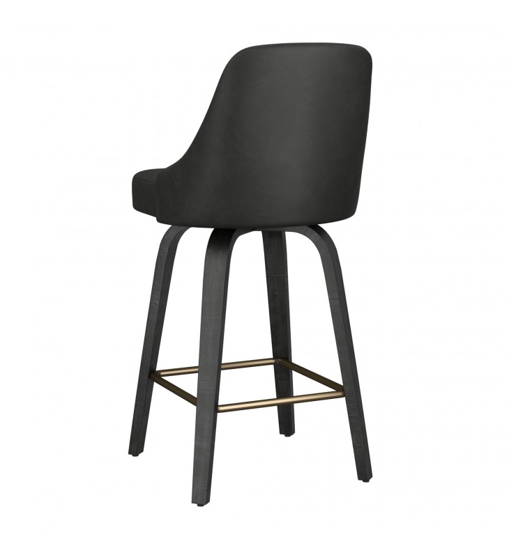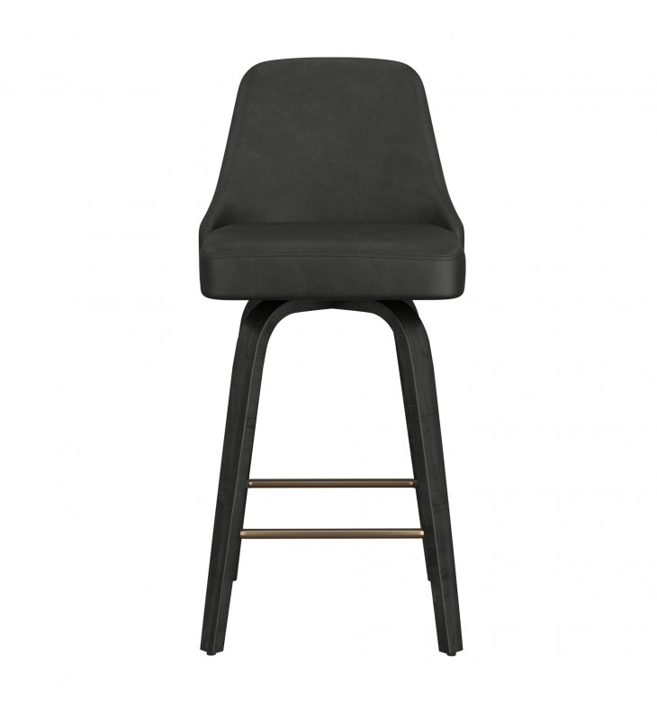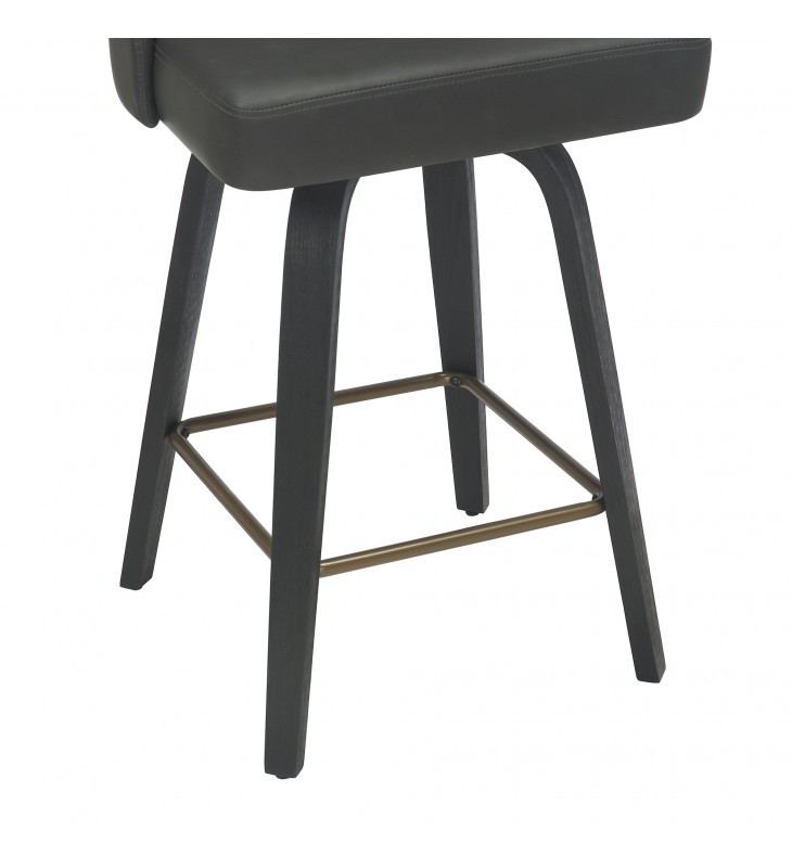 26\" counter height stool with 360¡ã swivel seat; Solid wood legs in a black finish and aged gold footrest; Oversized seat with vintage faux leather upholstery; Medium comfort polyester foam cushion; Approximate weight capacity is 300 lbs