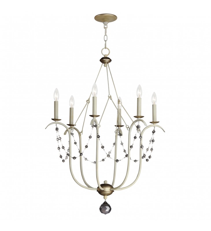 This series draws inspiration from regal agrarian manors, delivering a statement in its scale and sophisticated finishes. Designed in operatic proportions, the bottom chandelier assembly features swollen curves hand painted in a choice of Ecru White or Golden Noir and suspended by a rigid hook structure replete with vintage charm. These finish combinations not only add dimension and interest, but they are enhanced with the contrastingly brighter accents against the rich, weathered finishes. Extended chain links with smoky beveled crystal charms drape the Ecru and Gold Leaf finish combination, while the darker Golden Noir variation features strands of patinaed silver wooden beads.