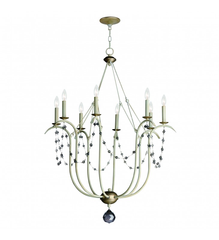 This series draws inspiration from regal agrarian manors, delivering a statement in its scale and sophisticated finishes. Designed in operatic proportions, the bottom chandelier assembly features swollen curves hand painted in a choice of Ecru White or Golden Noir and suspended by a rigid hook structure replete with vintage charm. These finish combinations not only add dimension and interest, but they are enhanced with the contrastingly brighter accents against the rich, weathered finishes. Extended chain links with smoky beveled crystal charms drape the Ecru and Gold Leaf finish combination, while the darker Golden Noir variation features strands of patinaed silver wooden beads.