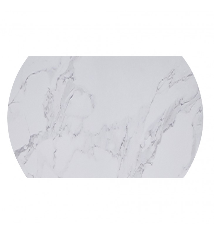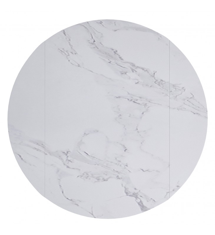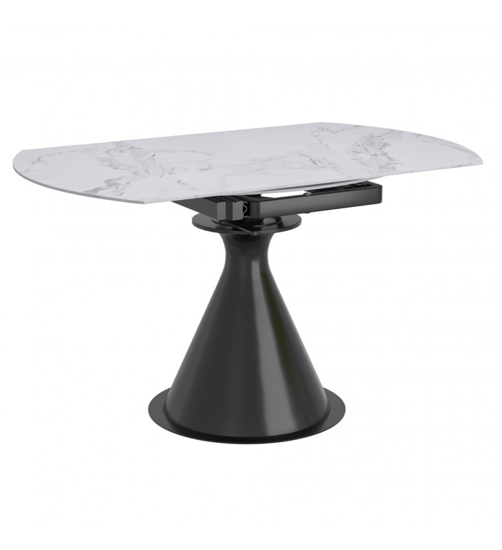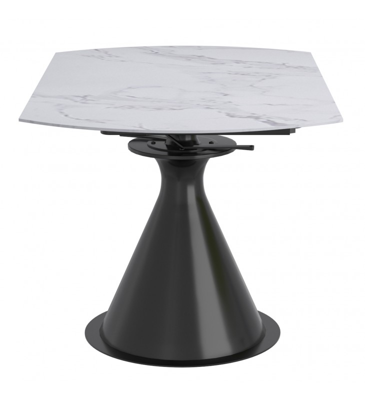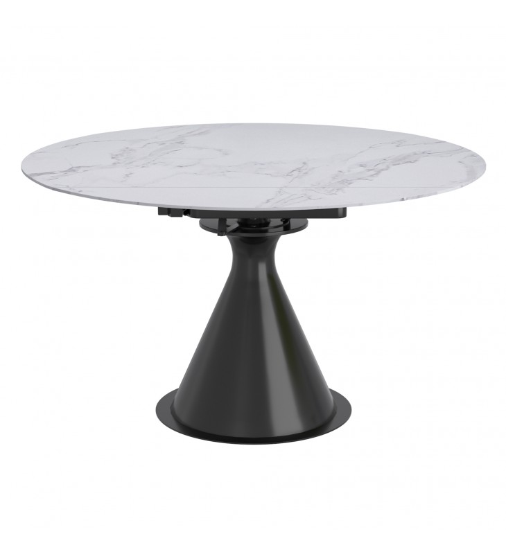 Contemporary extension dining table; Easy-to-use, one-handed rotating extension mechanism; Sintered stone table top is waterproof and heat, stain and scratch-resistant; Extended round table can comfortably fit 6 chairs; Sturdy, black metal, cone-shaped pedestal base