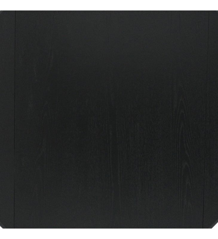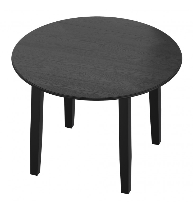 Modern 42\" round dining table; Drop-leaf design is perfect for smaller spaces, each leaf is 8\"; Engineered wood table top has black finish with visible wood grain; Solid rubberwood legs with black finish; Modern wood and upholstered dining chair