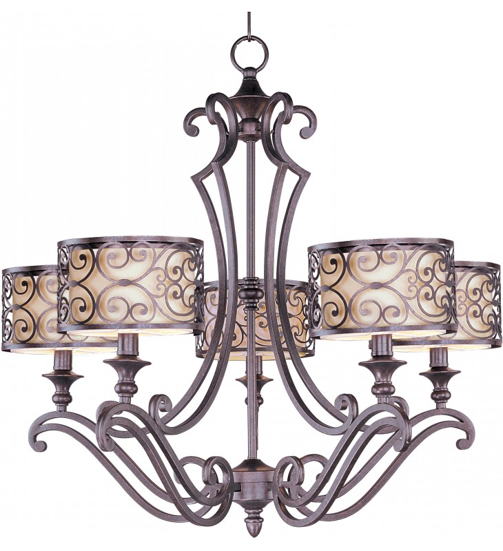 Mondrian, a Mediterranean inspired collection, features a forged-iron frame finished in Umber Bronze. The warm glow emitted through the delicate pattern of the metal silhouette gently radiates through the off-white fabric shades to create an interesting lighting effect.