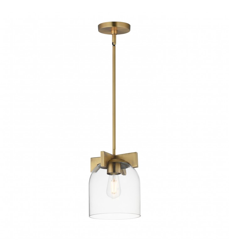 Cut-out metalwork curves around modern bell-shaped glass shades. The series includes pendants and bath vanities available in either Clear or a swirling Marble glass. Available in various complementary finishes: Polished Chrome, Matte Black, or Natural Aged Brass these fixtures make a delightful addition to bathroom spaces, bedrooms, or over a kitchen island.