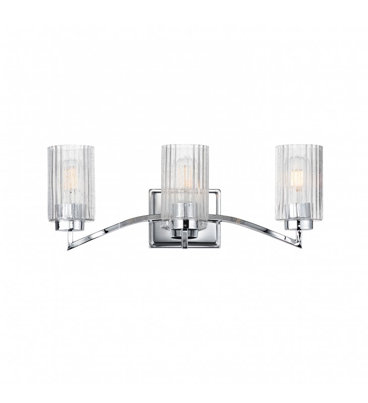 Clear Ribbed glass cylinders are supported on gracefully sweeping frames. The glass pattern helps to diffuse the light source while adding texture and style to the design. Available in Polished Nickel, Satin Champagne, or Matte Black.