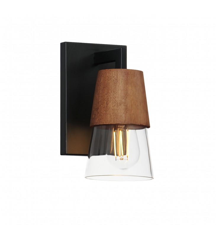 Capped by wood finished in Walnut, this series of bath vanity sconces feature conical Clear Glass shades. Contrasting Matte Black frames of squared tubing add clean geometry to the design. Use decorative lamps in the shades to complete the look.