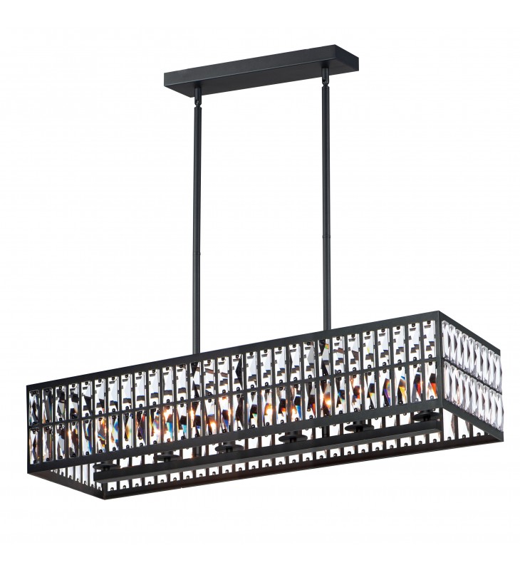 Rectilinear Beveled Crystals bejewel a Matte Black frame creates stark contrast to this radiantly prismatic display of light. The bound crystal is fixed to the frame to reduce time spent dressing the fixture.