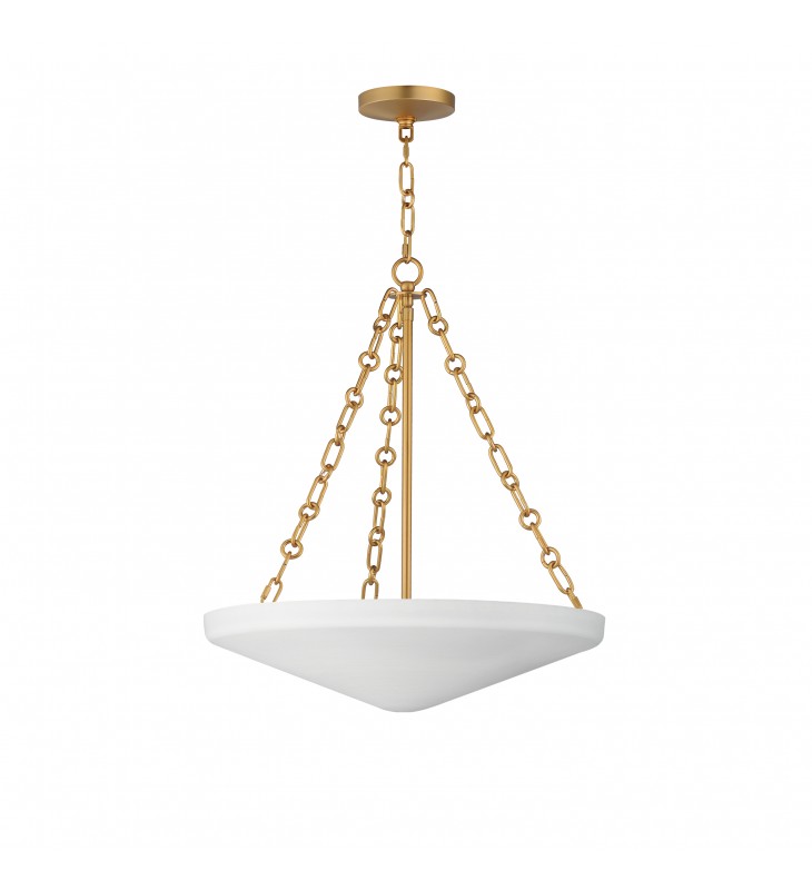 An inverted steel cone vessel painted in textured Plaster White gesso provides ambient lighting with classical styling. The stylized ring and oval chain links in Natural Aged Brass compliment the overall design. Available in two sizes of pendants and flush mount.