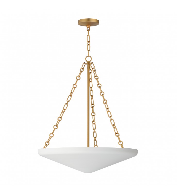 An inverted steel cone vessel painted in textured Plaster White gesso provides ambient lighting with classical styling. The stylized ring and oval chain links in Natural Aged Brass compliment the overall design. Available in two sizes of pendants and flush mount.